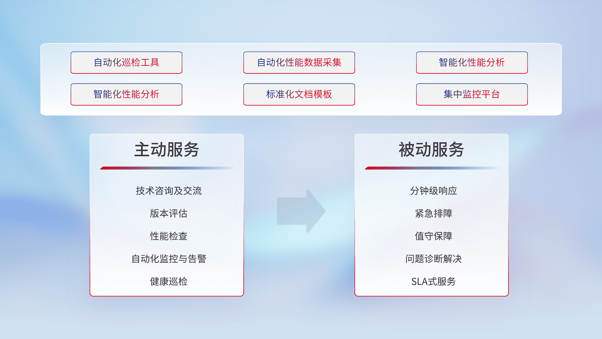 智能化工具和标准化文档,,保障服务质量,,提供主动服务(包含技术咨询、、、、版本评估、、、性能检查、、、、自动化监控与告警、、、健康巡检)和被动服务包含(分钟级响应、、紧急排障、、、、值守保障、、问题诊断解决、、、、SLA服务)。。。
